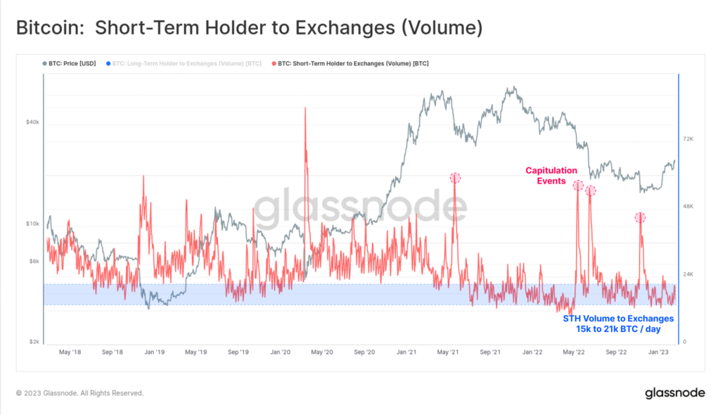 Źródło: GlassnodeW odniesieniu do absolutnego wolumenu BTC, STH przez cały czas nie wydają się szczególnie zmotywowani do wysyłania monet na giełdy. Całkowity wolumen STH-Exchange oscyluje pomiędzy 15k a 21 tys. BTC dziennie – nie zmnienił się znacząco od czerwca 2021 roku.