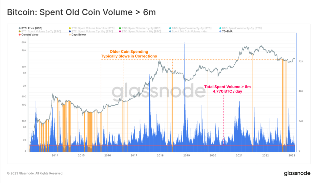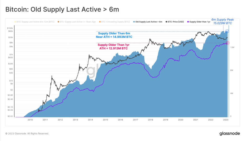 Źródło: GlassnodePatrząc na starą podaż, BTC uśpione przez co najmniej pół roku, znajdują się bardzo blisko nowego ATH na poziomie 15 mln BTC. Glassnode przedstawił również całkowitą podaż BTC starszych niż 1 rok, która w tym tygodniu przekroczyła ATH, przebijając się powyżej 12 913 mln BTC. Pomimo presji regulacyjnej i olbrzymiego rajdu od początku roku, 'starzy inwestorzy’ pozostają praktycznie niewzruszeni.