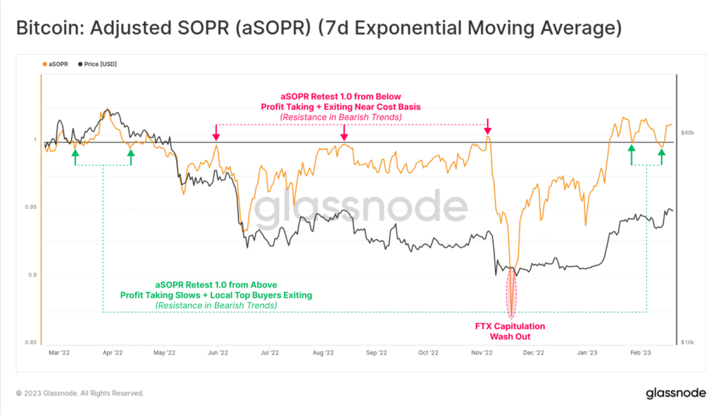 Źródło: GlassnodeGlassnode śledzi presję na realizacje zysków w kilku wariantach SOPR, które znajdują zwykle wsparcie na neutralnej wartości 1,0. Ponowny test 1,0 przez SOPR podczas byczego momentum wskazuje na spowolnienie realizacji zysków (co w przeciwnym razie stanowiłoby presję wzrostową na SOPR), a posiadacze BTC ze stratą spowalniają swoje wydatki (w przeciwnym razie presja spadkowa na SOPR). Ogólnie rzecz biorąc, wskaźnik w tej chwili sygnalizuje to zmniejszenie presji podażowej i potencjalny powrót myślenia „buy-the-dip”. Przekonujący retest SOPR i odbicie od 1,0, zwłaszcza na długoterminowych średnich ruchomych (na przykład 14D lub 30D), jest często sygnałem zmiany trendu rynkowego.