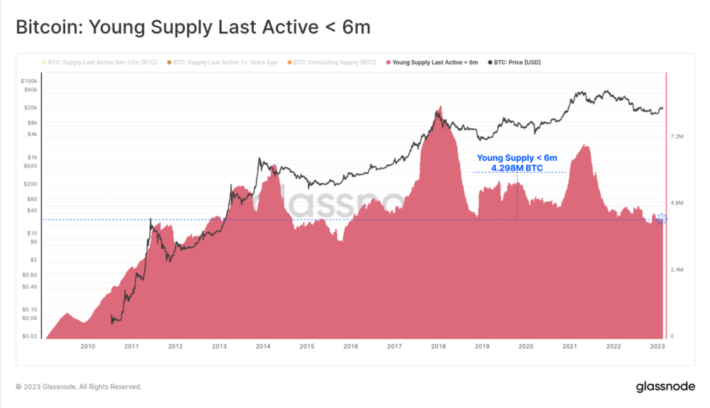 Źródło: GlassnodeCałkowita podaż BTC młodszych niż 6 miesięcy nie wzrosła znacząco w ujęciu rocznym i oscyluje wokół 4,298 mln BTC. Sytuacja ta wskazuje, iż BTC zakupione wcześniej niż 6 miesięcy są w tej chwili uśpione a ich posiadacze są prawdopodbnie dalecy od chęci realizacji strat.