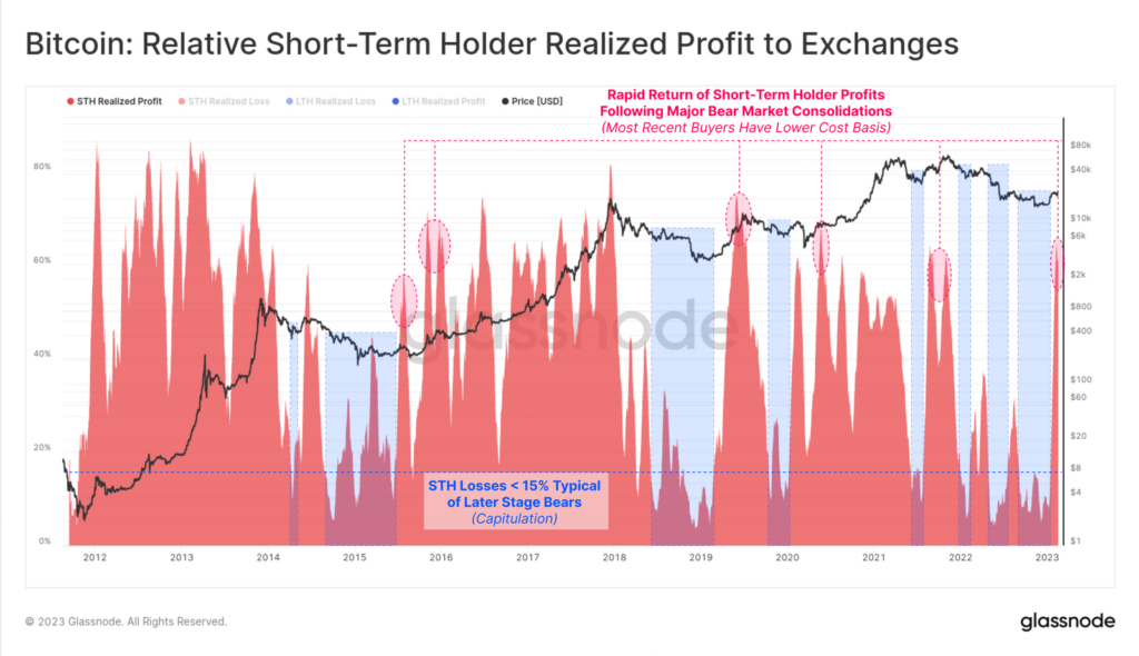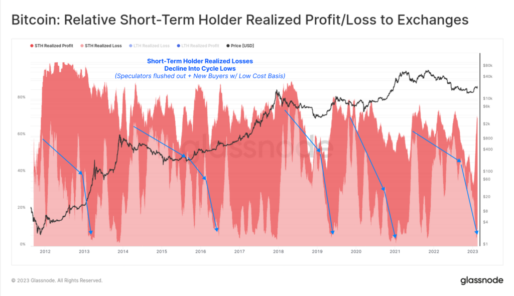 Źródło: GlassnodeTen wykres pokazuje względny udział zrealizowanych zysków i strat grupy inwestorów STH, przefiltrowanych przez Glassnode pod kątem BTC wysyłanych na giełdy, aby jak najlepiej odzwierciedlić potencjalną siłę sprzedaży. Możemy obserwować trend coraz mniejszych strat realizowanych przez STH (blisko dołków z poprzednich cykli) jako iż spekulanci są stopniowo usuwani przez rynek, a BTC trafiają do nowych kupujących budujących nową strukturę cenową z niższą podstawą kosztową.