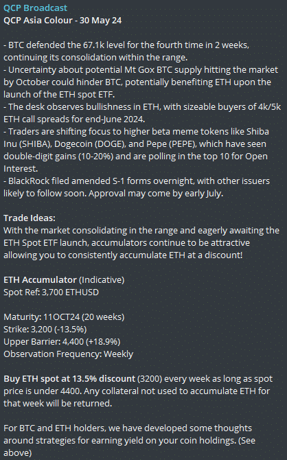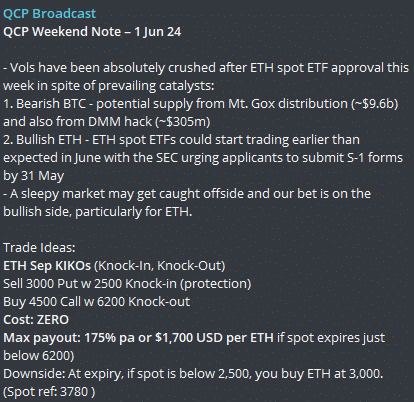 fot. QCP Capital / TelegramEksperci uważają, iż ów nagły rozwój wydarzeń może poważnie zaskoczyć chwilowo uśpiony rynek. Zakładają więc scenariusz mocno prowzrostowy dla Ethereum oraz altcoinów jako takich. Według autorów notatki wprowadzenie spotowych funduszy ETF Ethereum spowoduje gwałtowny napływ środków od klientów detalicznych i instytucjonalnych, windując średnioterminowo kurs kryptowaluty.