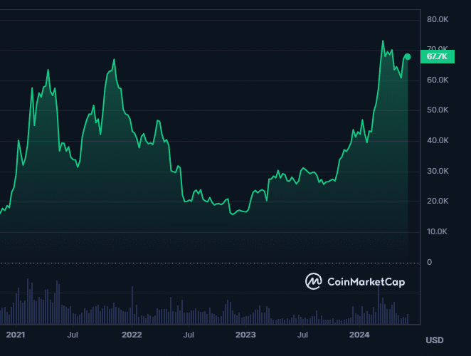 Na moment powstawania tego tekstu cena Bitcoina wynosiła ok. 67,7 tys. USD za sztukę.