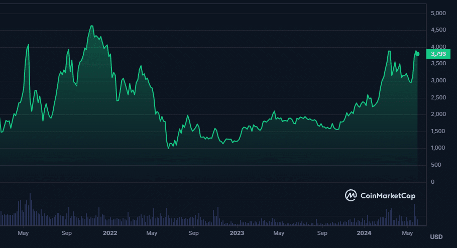 Na moment powstawania tego tekstu cena Ethereum wynosiła ok. 3800 USD za monetę.