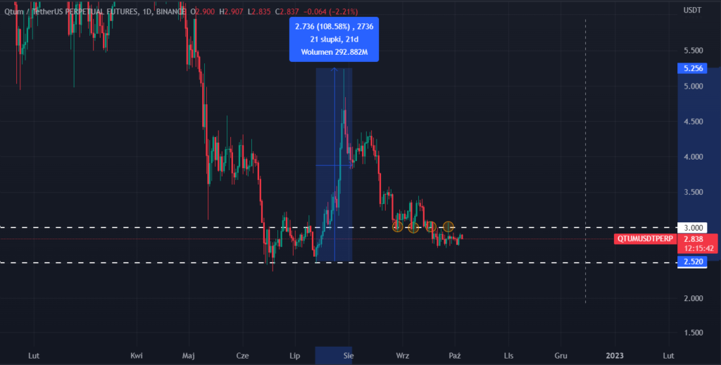 Obecnie notowania tej kryptowaluty są na poziomie w okolicach 2,8$. Poziom 3$ będzie stanowił poziom oporu, który wcześniej był wielokrotnie testowany jako wsparcie, a po przebiciu linia zamienia się w opór. Odbicie się w dół od tego oporu sugeruje bardzo prawdopodobne podejście pod wsparcie na poziomie 2,5$, które jednocześnie stanowi dołek zanotowany w czerwcu tego roku. Ewentualne przebicie tego poziomu sugeruje wyprzedaż choćby w kierunku 1,5$.