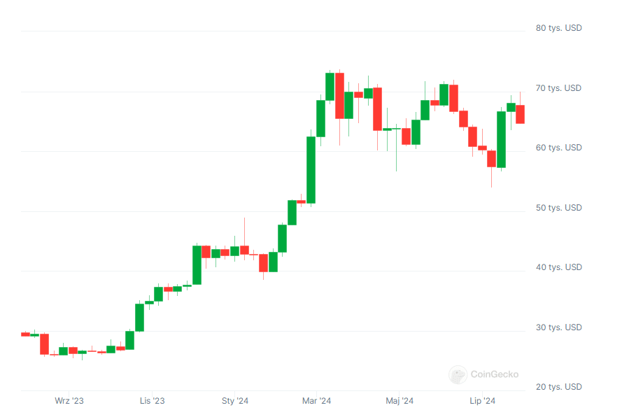 Wykres kryptowaluty Bitcoin, para BTCUSD, interwał roczny, źródło: CoingeckoPo halvingu przyszedł zresztą jeszcze jeden nieoczekiwany kontratak ze strony byków: konflikt polityczny w USA z kryptowalutami w tle. Aż 25% obywateli Stanów Zjednoczonych posiada jakieś waluty cyfrowe, a b. prezydent Donald Trump postanowił wystartować jako „kandydat pro-krypto”. Oliwy do ognia dodał jeszcze nieudany zamach na Trumpa oraz konferencja w Nashville, które sprawiły, iż Bitcoin i kryptowaluty memowe nawiązujące do kandydata Republikanów zaczęły wyraźnie rosnąć.