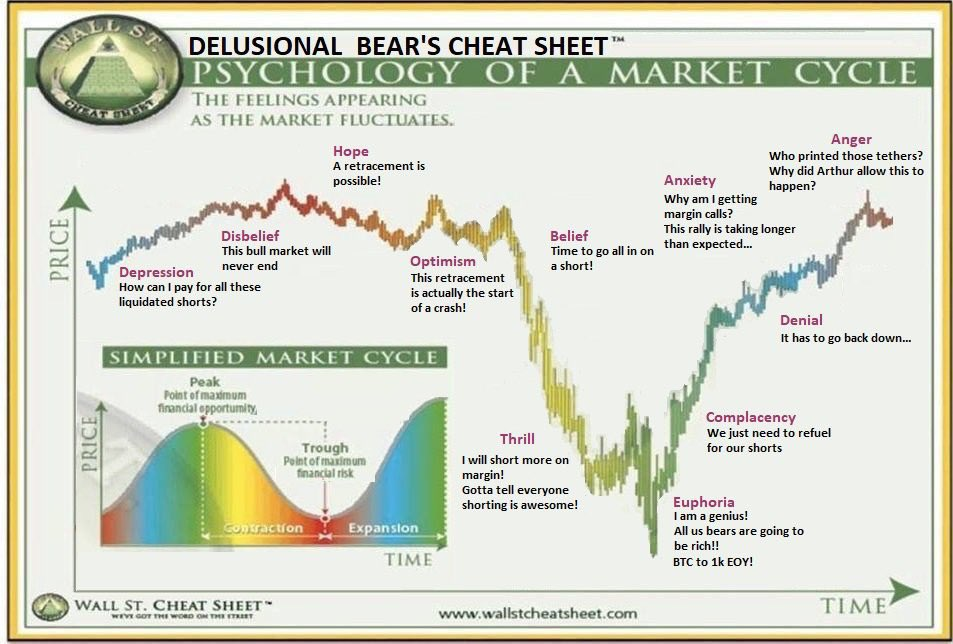 Najciekawszym elementem wykresu poza opisaniem uczuć inwestorów zależnych od głębokości spadków lub wzrostów jest odwrócona percepcja ryzyka. Ponieważ w czasie trwania euforii rynki widzą kupno jako olbrzymią szansę (iluzja), a w chwili ekstremalnego wyprzedania kupno wydaje im się ekstremalnie ryzykowne. W rzeczywistości sytuacja powinna być odwrotna, taniejące aktywa powinny zwracać na siebie uwagę inwestorów, a drożejący rynek nie powinien wyglądać zachęcająco by wejść. Źródło: Wallstcheatscheet#Bitcoin