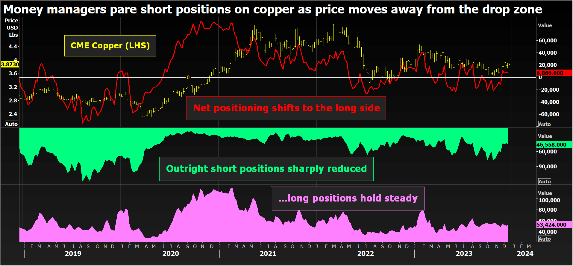 Zmiana w pozycjonowaniu trwa od końca października. Przewidywane załamanie nigdy nie nastąpiło. Odbicie cen wywołało zmianę stanowiska wśród hedgingowych funduszy, polujących na momentum. Efekt został wzmocniony przez oczekiwania, iż cykl zacieśniania stóp procentowych w USA osiągnął szczyt, a podaż miedzi nie jest tak duża, jak wcześniej sądzono.