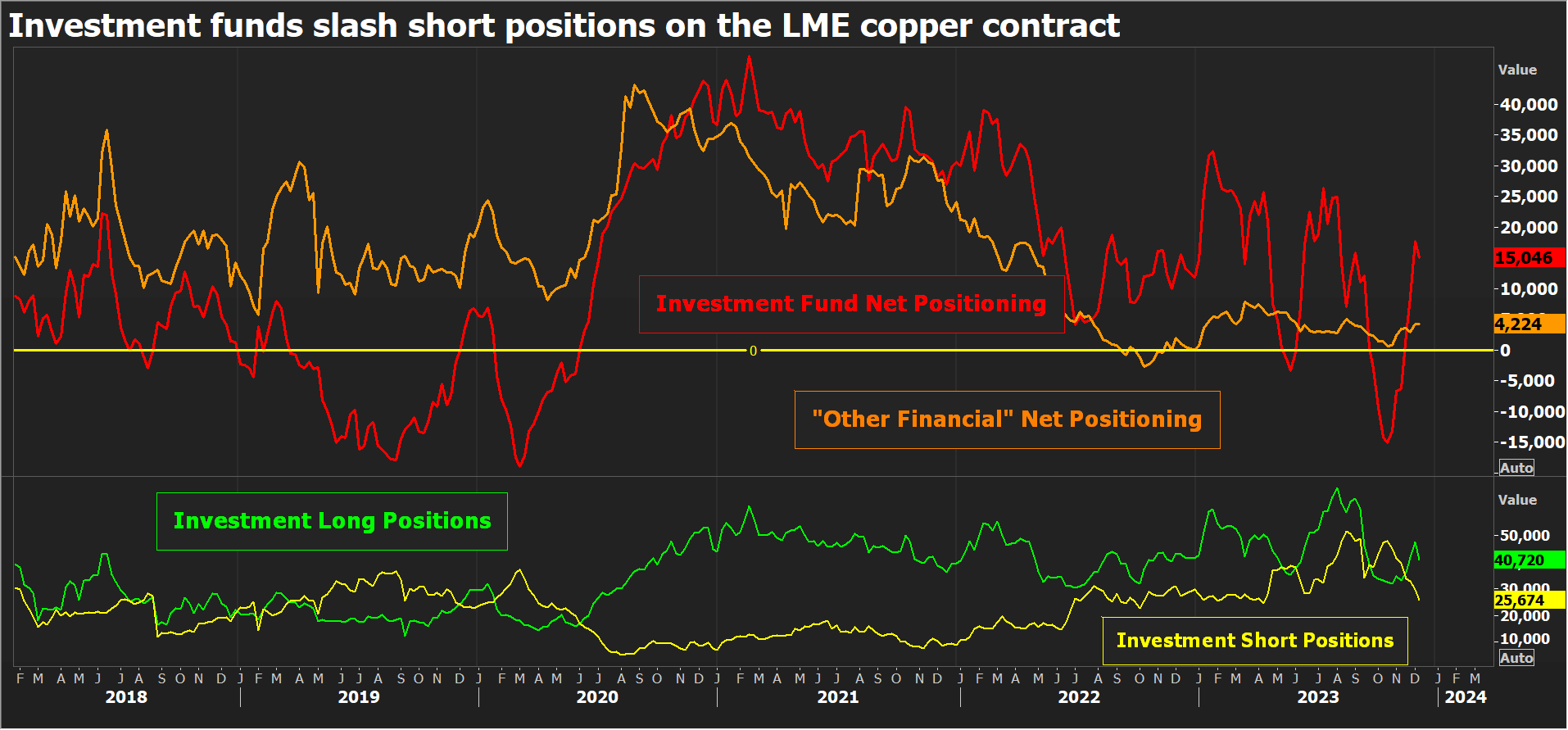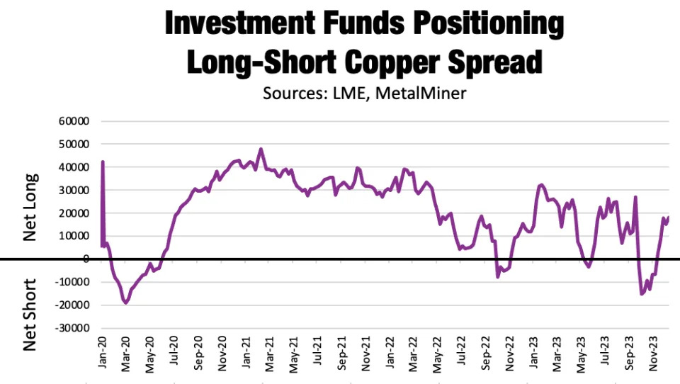 Zamknięcie kopalni w Panamie zmniejszyło już podaż surowca o około 40 000 ton jeżeli pozostanie zamknięta do maja, w 2024 r. podaż spadnie o dodatkowe 160 000 ton. Chociaż samo to nie wystarczy, aby przesunąć rynek do deficytu (z obecnej nadwyżki), niższa podaż, zwłaszcza przed prognozowanymi deficytami podaży w nadchodzących latach, zapewniłaby wsparcie dla cen. Fundusze inwestycyjne mają coraz więcej długich pozycji netto. Ich pozycjonowanie wydaje się odzwierciedlać zmieniające się na korzyść, 'proinflacyjne’ perspektywy na rynkach. Masowo fundusze zaczęły likwidować shorty w październiku. Już w listopadzie powróciły do średnio byczych pozycji długich netto. Jednocześnie, całkowite wolumeny pozycji spadły w ostatnich miesiącach. Wniosek jest taki, iż wiele z nich wycofuje się z rynku. Podaż w kopalniach pozostaje w zawieszeniu, globalne perspektywy gospodarcze również. najważniejsze sektory, takie jak pojazdy elektryczne, które stanowiły podstawę wielu prognoz popytu w nadchodzących latach, stoją w obliczu poważnych niepowodzeń.
