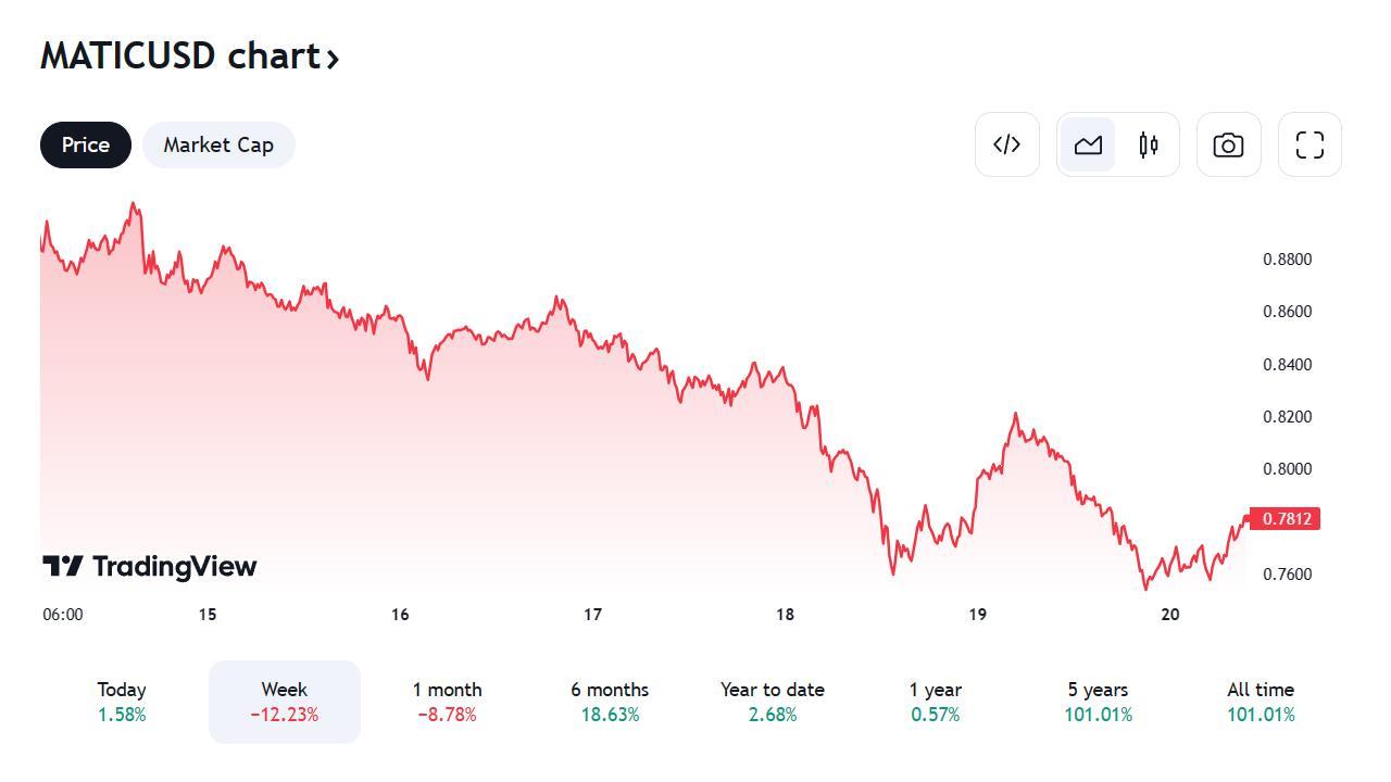 Polygon (MATIC): Polygon, znany ze swoich rozwiązań do skalowania, przekroczył poziom 0,80$, ale spotkał się ze spadkiem o 4,4%. Jego odporność powyżej poziomu 0,75$ pokazuje zaufanie rynku. Potencjał wzrostu Polygon jest powiązany z szerszymi trendami rynkowymi i postępem technologicznym, a wyzwaniami są zmienność rynku i konkurencja.