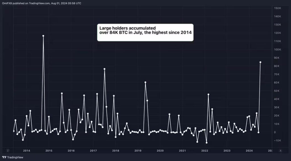Z danych udostępnionych przez firmy IntoTheBlock i TradingView, duzi posiadacze, czyli adresy posiadające co najmniej 0,1% podaży Bitcoina w obiegu, w lipcu zgarnęli ponad 84 tys. BTC o wartości 5,4 mld USD po bieżącej cenie rynkowej. To największa jednomiesięczna suma w ujęciu BTC od października 2014 roku.