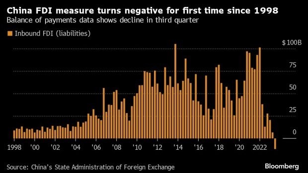 Wskaźnik Foreign Direct Investment pierwszy raz od 1998 roku pokazał spadek w III kwartale 2023 roku. Kapitał odpływa z Chin. Źródło: Bloomberg