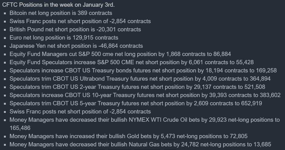 Raportowane przez Federalną Komisję Handlu USA, (CFTC) zmiany pozycji w tygodniu zakończonym 3 stycznia. Bycza zmiana na złocie, niedźwiedzia na ropie wskazuje, iż spekulanci wciąż widzą recesję jako scenariusz bazowy. Zarówno spekulanci jak i zarządzający funduszami menadżerowie zmniejszyli bycze zakłady na S&P 500 prognozujac spadek rynku akcji. Źródło: CFTT, FJWnioski: