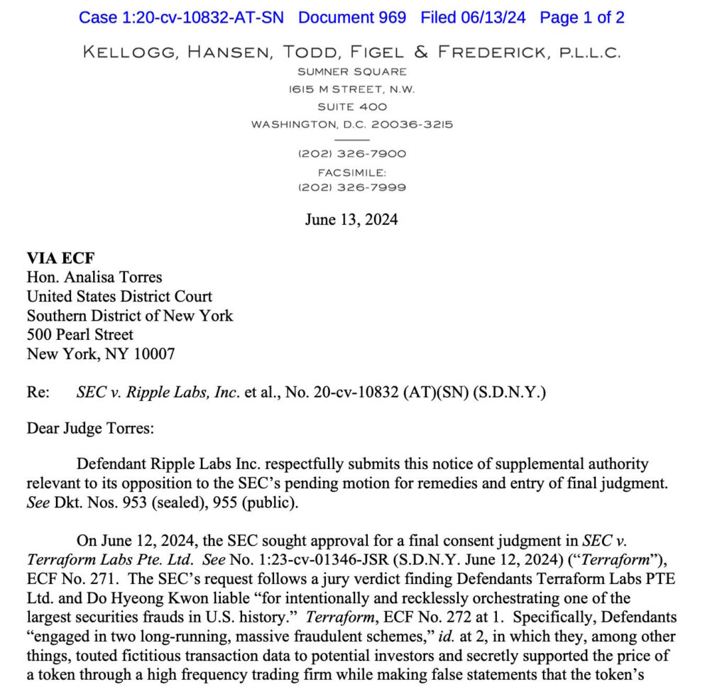 W pozwie złożonym 13 czerwca w Sądzie Okręgowym Stanów Zjednoczonych dla Południowego Okręgu Nowego Jorku zespół prawny Ripple złożył zawiadomienie o wydaniu dodatkowego uprawnienia, w którym zarzucił „nieuzasadnioną” karę cywilną nałożoną przez SEC, powołując się na ugodę w sprawie Terraform. Przed złożeniem wniosku przez Ripple sędzia federalny zatwierdził umowę o wartości 4,5 miliarda dolarów pomiędzy SEC a Terraform Labs i jej współzałożycielem Do Kwonem.