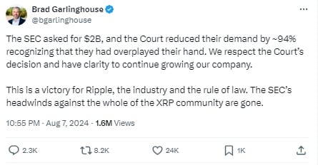 Źródło: https://x.com/bgarlinghouse/status/1821289051191963861Cała sprawa ciągnęła się od 2020 roku. Wtedy SEC oskarżyła Ripple o to, iż zbiera pieniądze od inwestorów w ramach sprzedaży XRP bez rejestracji. Obserwatorzy rynku kryptowalut oceniają, iż to może być przełomowe rozstrzygnięcie dla całej branży, a w szczególności dla sposobu, w jaki SEC reguluje kryptowaluty.
