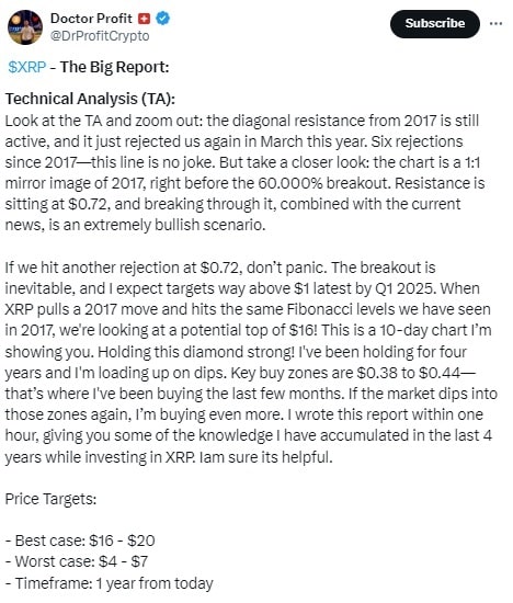 Doctor Profit, popularny trader i analityk kryptowalut, ocenił, iż powrót do poziomów sprzed 2020 roku lub wyższych, może zająć XRP kilka miesięcy. Jego analiza techniczna sugeruje, iż token może osiągnąć teraz znacznie więcej niż poprzedni rekord wynoszący 3,84 dolara. Według analityka, jeżeli powtórzą się schematy z 2017 roku, które poprzedziły wzrosty, XRP może osiągnąć poziom od 16 do 20 dolarów. Jako jego mocne strony Doctor Profit wskazuje wyjątkową odporność na kryzysy oraz liczne współprace Ripple.