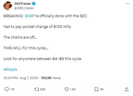 Źródło: Źródło: https://x.com/DrProfitCrypto/status/1821325681847927294Bardziej realistyczne, choć wciąż bardzo ambitne cele, przedstawił 360 Trader. Analityk ocenia, iż w związku z pozytywnymi wydarzeniami wokół Ripple, XRP może wzrosnąć do przedziału od 4 do 8 dolarów. Według niego dotychczasowa niepewność prawna została usunięta, co może pomóc XRP w osiągnięciu tego celu.