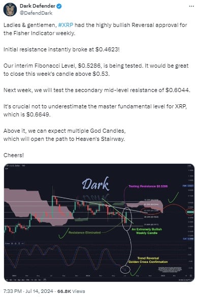 W jednym z ostatnich postów na X Dark Defender napisał, iż dostrzega potwierdzenie wysoce zwyżkowego odwrócenia kursu XRP, oznaczonego cotygodniowym zatwierdzeniem wskaźnika Fishera (Fisher transform). Sygnał ten często wskazuje na znaczną zmianę nastrojów na rynku i sugeruje potencjalne wzrosty w nadchodzących tygodniach.