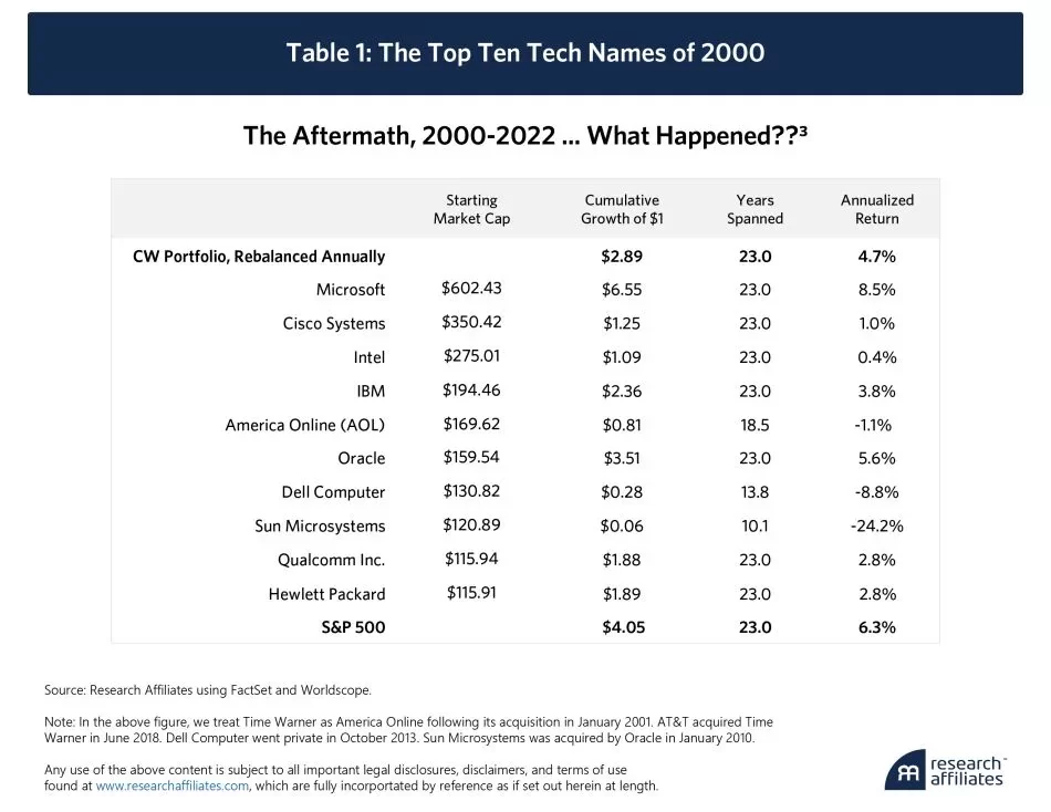 Zwroty z akcji czołowych spółek z bańki dot-com. S&P500 bije roczne średnie zwroty większości z nich od 2000 roku. Co nam to mówi?