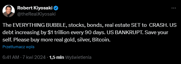 Robert Kiyosaki jest znany przede wszystkim (poza znanemu prawie każdemu bestsellerowi) ze swojego sceptycyzmu wobec tradycyjnych systemów finansowych a w szczególności dolara amerykańskiego. Przez dekady polecał w zasadzie te same lub zbliżone kategorie aktywów (plus pewne „smaczki”), przy czym Bitcoina po raz pierwszy zarekomendował prawdopodobnie 14 sierpnia 2017 roku. W tamtym czasie BTC, złoto i srebro wyceniane były odpowiednio na 4300 USD za sztukę oraz 1281 USD i 17 USD za uncję metalu. Powracając do dnia dzisiejszego, nietrudno zauważyć, iż inwestycje te wykazują imponujące wzrosty, z Bitcoinem na czele.