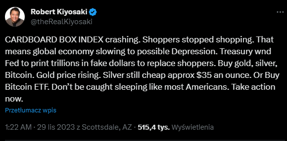 Kiyosaki zaznacza, iż „cena złota rośnie”, a srebro jest „wciąż tanie poniżej 35 dolarów za uncję”. Przypomina też o nadchodzącym zatwierdzeniu przez amerykańskiego regulatora rynku funduszu giełdowego typu ETF z BTC jako aktywem bazowym, którego zakup poleca ewentualnie w miejsce fizycznych bitcoinów.