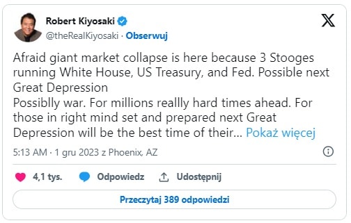 Źródło: https://twitter.com/theRealKiyosaki/status/1730440068844970160Z kolei tym, co może nas uchronić przed skutkami kryzysu, jest Bitcoin, złoto i srebro. W niektórych wpisach pojawiają się również nieruchomości. Jak pisał na X: Dla tych, którzy mają adekwatne nastawienie i są przygotowani, następny Wielki Kryzys będzie najlepszym okresem w ich życiu. Proszę, przygotuj się. Proszę, zadbaj o siebie. Kupuj złoto, srebro, Bitcoin.