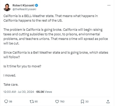 Źródło: https://twitter.com/theRealKiyosaki/status/1818043850721738917Kioysaki sądzi, iż Kalifornia jest stanem przewodnim, co oznacza, iż obszar ten jest swego rodzaju trendsetterem, który wyznacza trendy w pozostałych stanach. Według analityka to, co dzieje się w tej chwili w Kalifornii, najpewniej niebawem wydarzy się w pozostałych stanach. Dlatego Kiyosaki zadaje pytanie: „Skoro Kalifornia jest stanem przewodnim i bankrutuje, które stany pójdą ich śladem? Czy to już czas na przeprowadzkę?”.