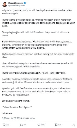 Właściwie cała prognoza analityka opiera się na przekonaniu, iż Donald Trump jest kimś w rodzaju wybawcy, który zapewni dobrobyt i realizację jego prognoz. We wpisie na X Kioysaki napisał: Trump sprawi, iż Ameryka znów będzie wielka„. Natomiast w zakończeniu posta możemy przeczytać: „Pomóżmy prezydentowi Trumpowi: Uczyń Amerykę znowu bogatą”.