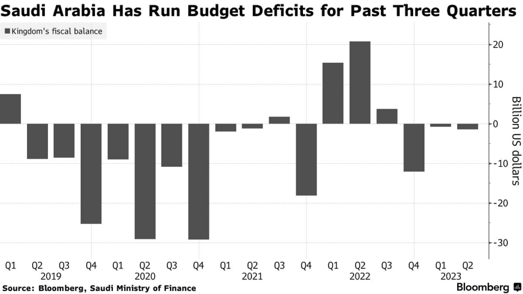 Te cięcia nakładają się na poziomy wydobycia obowiązujące w szerszej grupie globalnych producentów OPEC. Oczywiście globalne perspektywy gospodarcze są przyćmione przez słabe dane z Chin i obawy przed recesją w USA. Ale rynek ropy nie czeka – jest dziś wystarczająco dobrze by podnosić ceny. Według Bloomberg Economics, Rijad może potrzebować cen ropy na poziomie choćby 100 USD za baryłkę, aby pokryć wydatki rządowe. Cięcia Saudów doprowadziły produkcję do najniższego poziomu od lat, aby wzmocnić rynek i przeciwdziałać spadkowi cen.