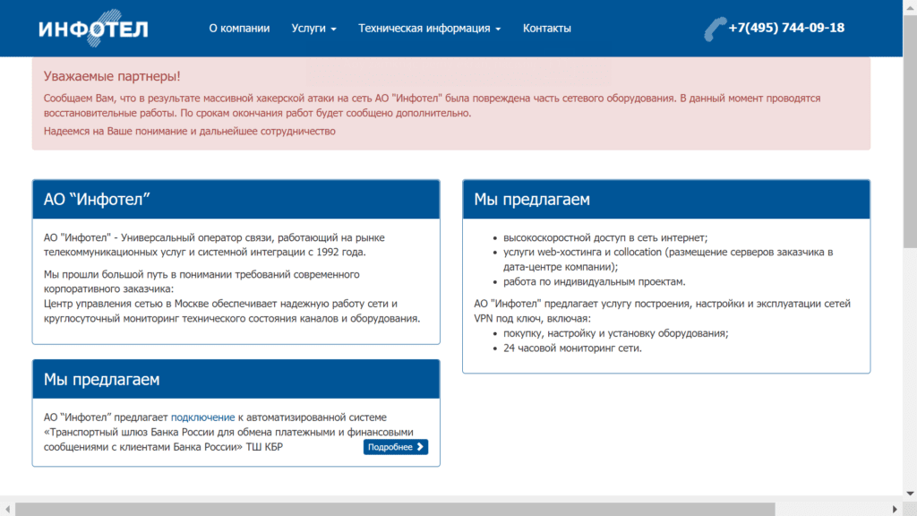 Ofiarą tych działań padło 15 witryn internetowych. Byłoby to głównie zwycięstwo propagandowe oraz podrażnienie legendarnie wrażliwego rosyjskiego ego, gdyby przy tej okazji nie udało się wyłączyć całego systemu płatności, który funkcjonuje w oparciu o Centralny Bank Federacji Rosyjskiej, a obsługiwany jest właśnie za pośrednictwem Infotel ISP.