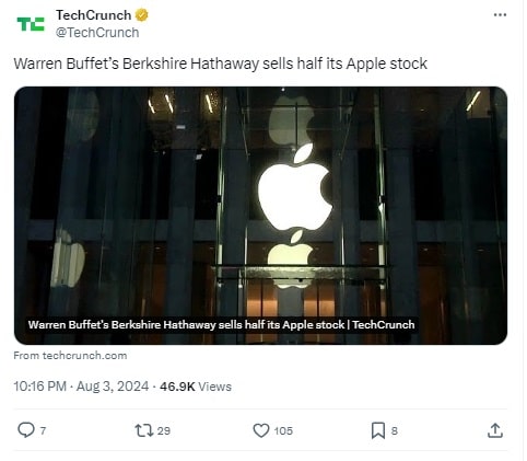 Źródło: https://x.com/TechCrunch/status/1819829800837460337Inwestorzy w panice zaczęli wyprzedawać akcje i aktywa. Wśród tych ruchów szczególnie wyróżnia się decyzją, którą podjął Warren Buffett. Kierowane przez niego Berkshire Hathaway pozbyło się blisko 50% akcji Apple. Jednak jeżeli przyjrzymy się bliżej jego ostatnim ruchom, można zadać sobie pytanie, Warren Buffett przeczuwał coś wcześniej?