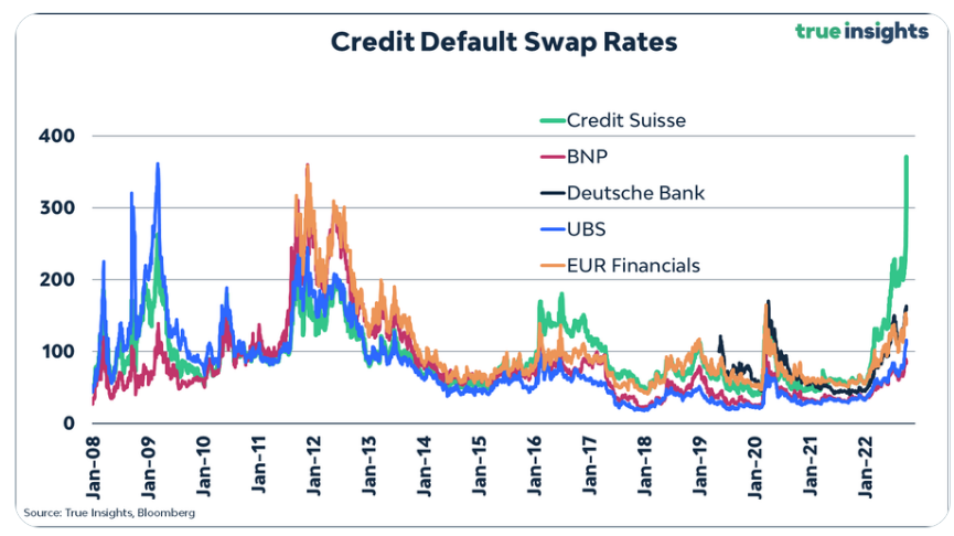 Błędem jest myślenie, iż rosnące CDSy dotyczą tylko Credit Suisse. Widzimy, iż rosną też w przypadku innych banków i finansowej strefy EUR. Europa jest szczególnie zagrożona głęboką recesją, która może nieść falę niewypłacalności. Kryzys energetyczny na tak wielką skalę zaskoczył rynek, który nie spodziewał się olbrzymiej wojny w Europie. Pytanie jak wiele małych, średnich a może choćby dużych przedsiębiorstw zbankurtuje przez rosnace ceny energii w otoczeniu słabnącego popytu (który chcą zdławić banki centralne walczące z inflacją)? Oraz kolejne pytanie. W jaki sposób może to dotknąć banki, które nie otrzymają z powrotem pożyczonych pieniędzy? Wydaje się, iż na prowadzenie wysuwa się Credit Suisse. Źródło: Bloomberg, TrueInsights