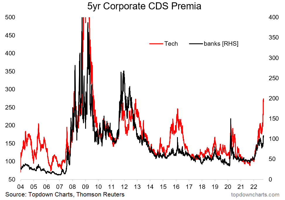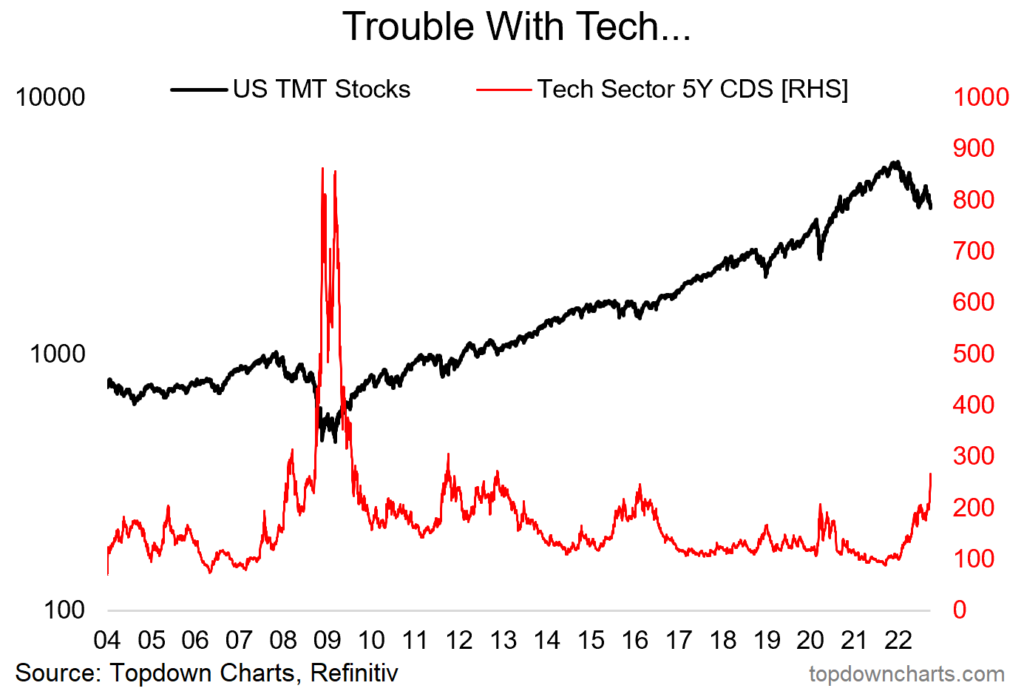 Amerykańskie spółki TMT (Telecom, Media, Technology) cierpią na polityce banków centralnych szczególnie, wykres pokazuje jak CDS służący finansowaniu zabezpieczeń branży technologicznej skokowo wzrósł przywodząc na myśl kryzys rozlewający się po rynku w latach 2007 – 2009. Źródło: Refinitiv, Topdown Charts