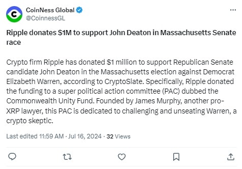 Firma Ripple Labs przekazała 1 mln dolarów wsparcia na kampanię Johna Deatona. Akcja, którą koordynuje prawnik, jest wymierzona w Elizabeth Warren. Senator Demokratów dała się poznać jako zagorzała przeciwniczka kryptowalut. Z kolei Deaton to prawnik, który znany jest ze swoich działań broniących branżę, w tym również Ripple.