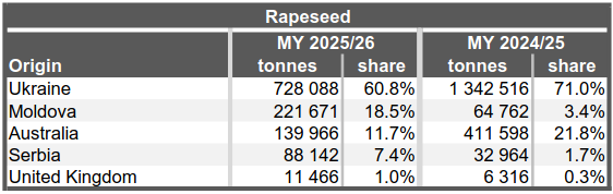 Ukraina wprawdzie pozostaje głównym dostawcą rzepaku do UE (61% udział), ale wolumen dostaw nasion do UE spadł aż o 46% w skali roku do tylko 728 tys. ton (patrz tabela).