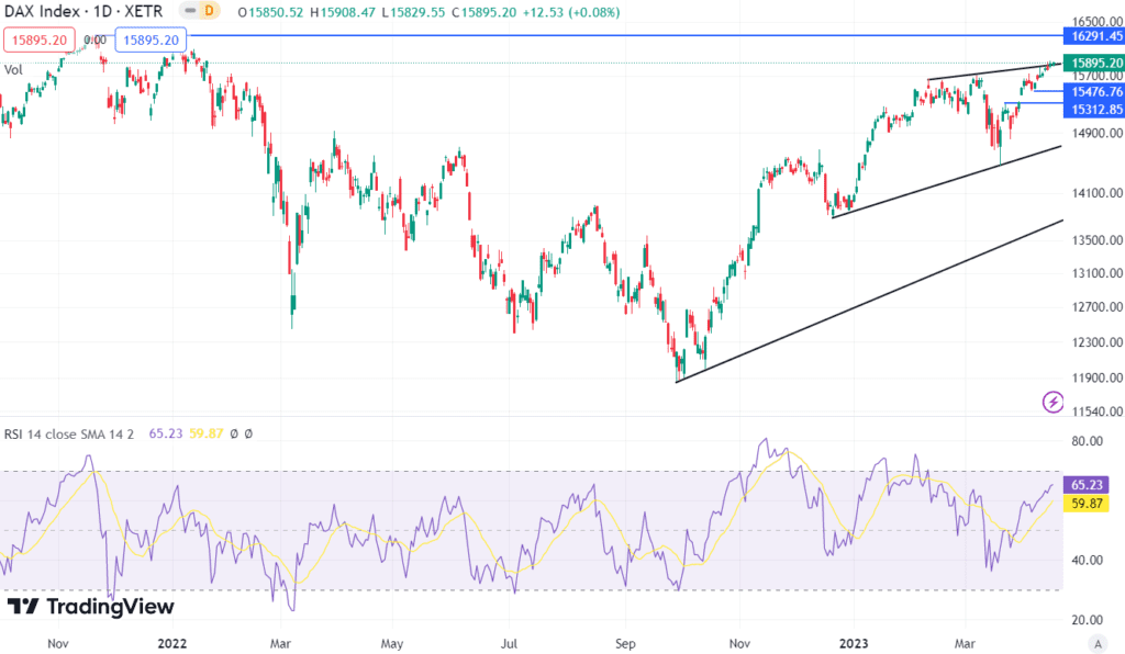 DAX podobnie jak S&P 500 konsoliduje się w okolicach maksimum. Jednak sytuacja niemieckiego indeksu największych spółek. DAX 40 mimo konsolidacji przy lokalnym szczycie, przebił maksimum z lutego i marca 2023 roku. Mimo przebicia tych oporów byki mają problem z rozwinięciem impulsu wzrostowego.