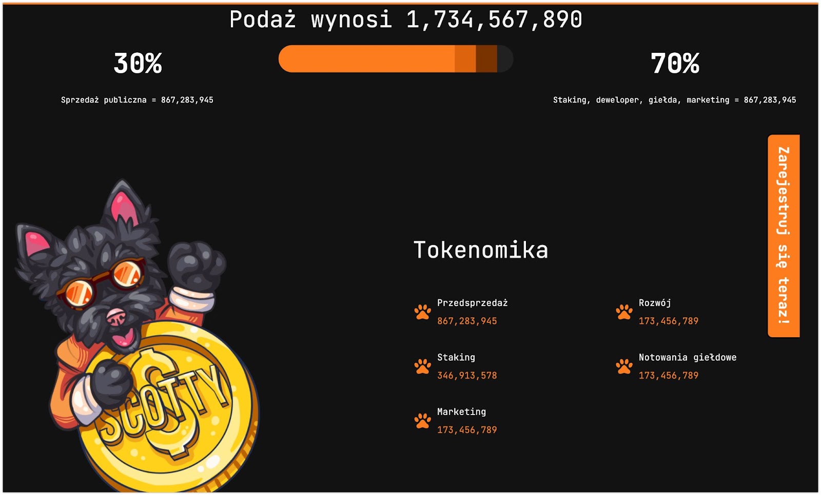Całkowita podaż $SCOTTY to 1 734 567 890. Około 50% tej wartości zostało przeznaczone do przedsprzedaży. Natomiast kolejne 20% jest przeznaczone na staking przez okres 3 lat.