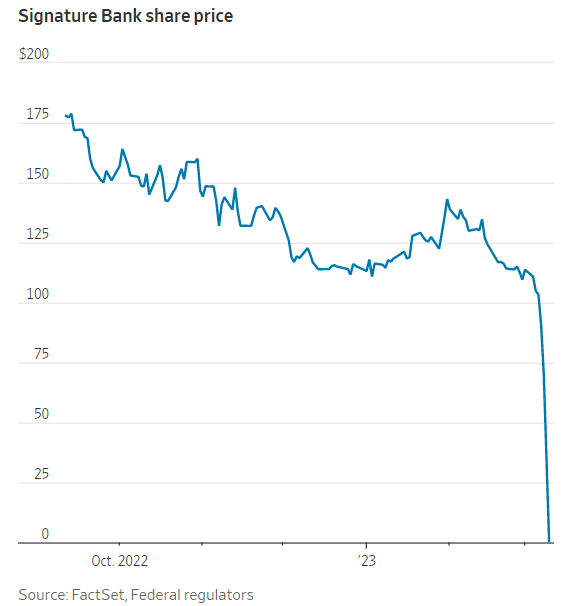 Walory banku w piątek zniżkowały blisko 30%. Signature Bank przyjmował m.in. klientów z rynku kryptowalut ale niedwano rakiem zacząć wycofywać się z tego biznesu. Prawdopodobnie w obawie przed odpływem depozytów – po zakażeniu Silvergate Capital. Wciąż nie jest pewne co doprowadziło do spektakularnego upadku.Wyjaśnieniem wydaje się run na wypłaty spowodowani niepewnością i bankructwem SVB. Jeszcze w czwartek Signature raportował silną pozycję finansową, z wielomilionowym skupem akcji własnych włącznie.