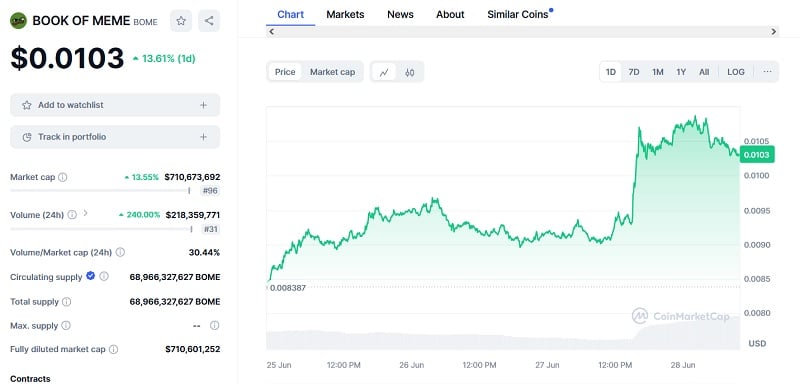 Fot. materiały partnera Pośród wyżej wymienionej trójki, w ciągu ostatnich 24 godzin najwięcej zyskał token Book of Meme ($BOME). Otóż ten memecoin zyskał na wartości o ponad 13 proc. Trzeba przyznać, iż jest to spora zmiana wartości kursu choćby jak na memecoiny. Mniejsze zyski w ostatnich 24 godzinach przyniosły monety Bonk (+7 proc.) oraz Slothana (+6 proc.).