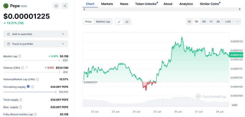Przypomnijmy, iż token $PEPE zadebiutował w 2023 roku, a jego ikoną jest zabawna żaba. Aktualnie znajduje się on w TOP 3 walut memowych, o ile uwzględnimy kapitalizację rynkową. W przypadku Pepe wynosi ona ponad 5 000 000 000 USD, dlatego token ustępuje wyłącznie memecoinom Dogecoin oraz Shiba Inu. Widać wyraźnie spore zainteresowanie tokenem Pepe, ponieważ tylko w ciągu ostatnich 24 godzin wolumen transakcji wyniósł blisko 550 000 000 USD. Lepiej pod tym względem wypadły tylko monety Dogecoin oraz DogWifHat.
