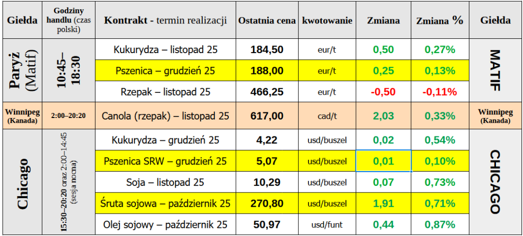 Zamknięcie środowej sesji na giełdowym rynku zbóż i oleistych – 08.10.2025: