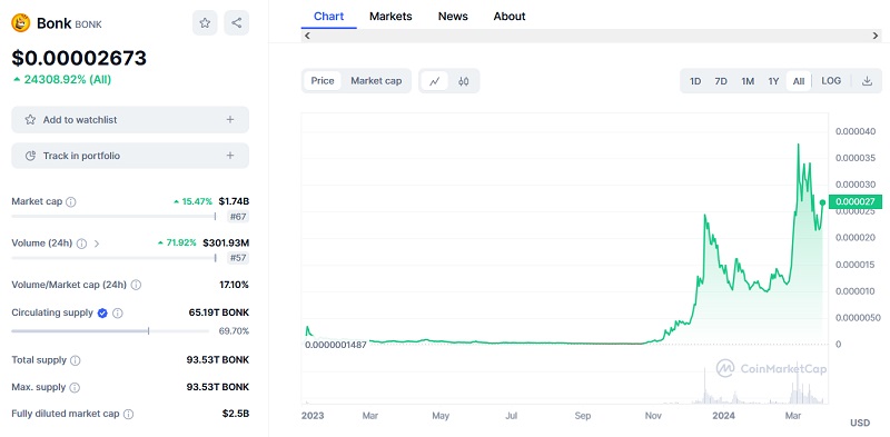 Faktem jest, iż tokeny $BONK odnotowały ogromny wzrost wartości. o ile przeanalizujemy wykres monety Bonk na giełdzie CoinMarketCap, od pierwszego notowania wartość tokenów $BONK wzrosła o ponad 24 000%. Tylko w ostatnich 12 miesiącach odnotowano aż blisko 5000% wzrostu.