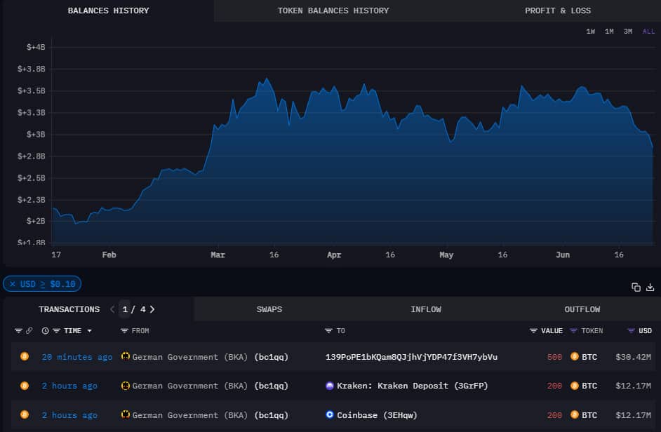 Niemiecki portfel oznaczony przez rząd po raz pierwszy przyciągnął na siebie uwagę obserwatorów rynku 19 czerwca, kiedy to wykonał transfer 6500 BTC o wartości ponad 425 milionów dolarów. Oprócz transferu do nieoznakowanych portfeli większość Bitcoinów jest z niego przenoszona na scentralizowane giełdy, co sygnalizuje, iż niemiecki rząd potencjalnie chce sprzedać Bitcoiny. Przed transferem na niemieckim portfelu licząc od lutego 2024 znajdowało się prawie 50 000 BTC od lutego 2024 roku. Uważa się, iż środki te zostały przejęte od operatora pirackiej strony internetowej Movie2k.