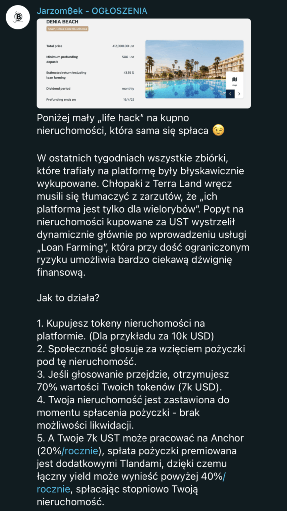 Kolejny projekt od polskich deweloperów to Terra Land. Łączy on świat cyfrowy ze światem „rzeczywistym” i pozwala na zakup całej lub części nieruchomości dzięki stablecoina UST. Takie działanie docelowo miało umożliwić budowę „safe haven” i pozwolić użytkownikom na dywersyfikację swoich portfeli za pośrednictwem inwestowania w jedno z najbardziej stabilnych i trwałych aktywów – w nieruchomości.
