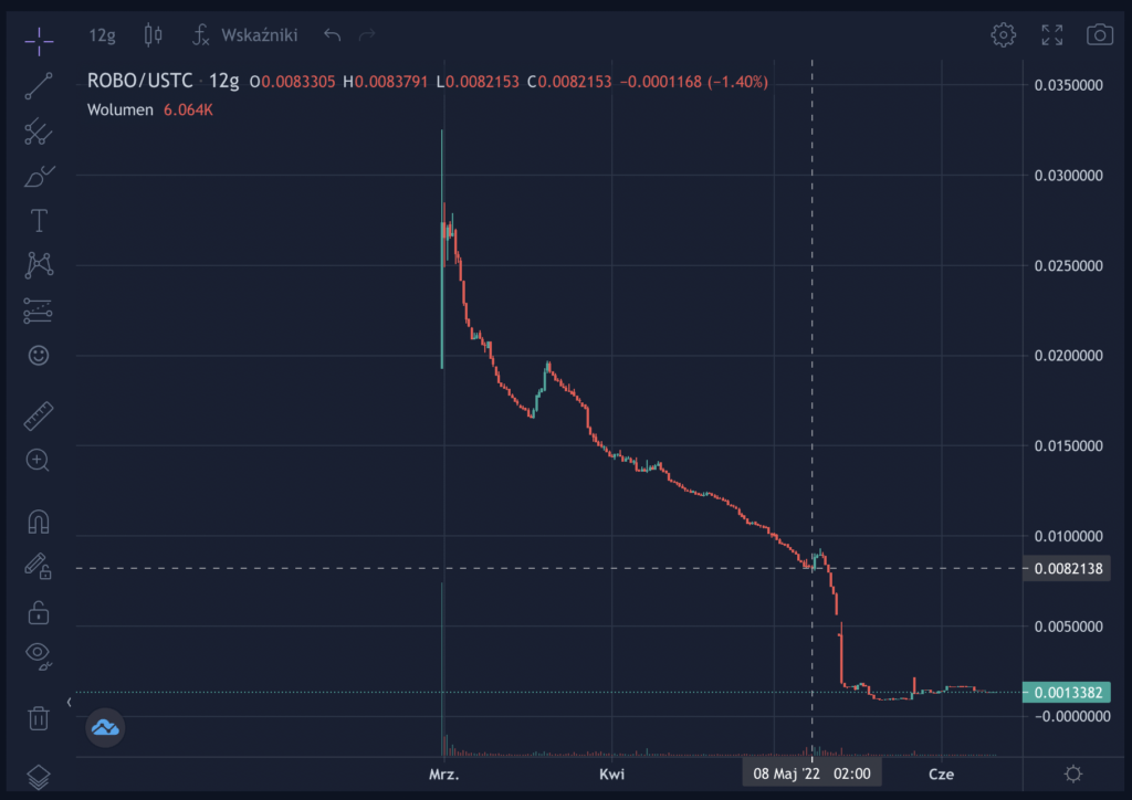 Cena tokenu ROBO w IDO wynosiła 0.012 UST z vestingiem 6 miesięcznym. Od listingu, który odbył się 28.02.2022 r. token spadł z 0.2 UST do 0.008 UST 8 maja, co stanowi spadek o 96% w ciągu około 2 miesięcy.