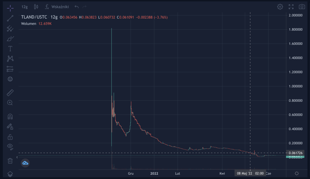 Cena tokenu Terra Land w IDO (Public Sale w liczbie 14 milionów tokenów) wynosiła 0,09 UST, a vesting wynosił 6 miesięcy, wobec czego pomimo regularnego spadku wartości tokena inwestor, który regularnie sprzedawał odblokowywane tokeny miał szansę na zarobek, gorzej, jeżeli nie brał udziału w IDO i zakupił tokeny z rynku.