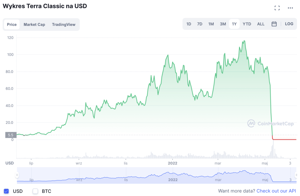 Cena LUNA 01.09.2021 r. wynosiła około 31 $ a 8.09.2022 r. (w pierwszy dzień poważnych problemów UST) było to dwa razy więcej, gdyż aż 64$, wato także zaznaczyć, iż LUNA swoje ATH w wysokości 116$ osiągnęła 4.04.2022 r., gdy token STT kosztował już tylko 1,5 $.