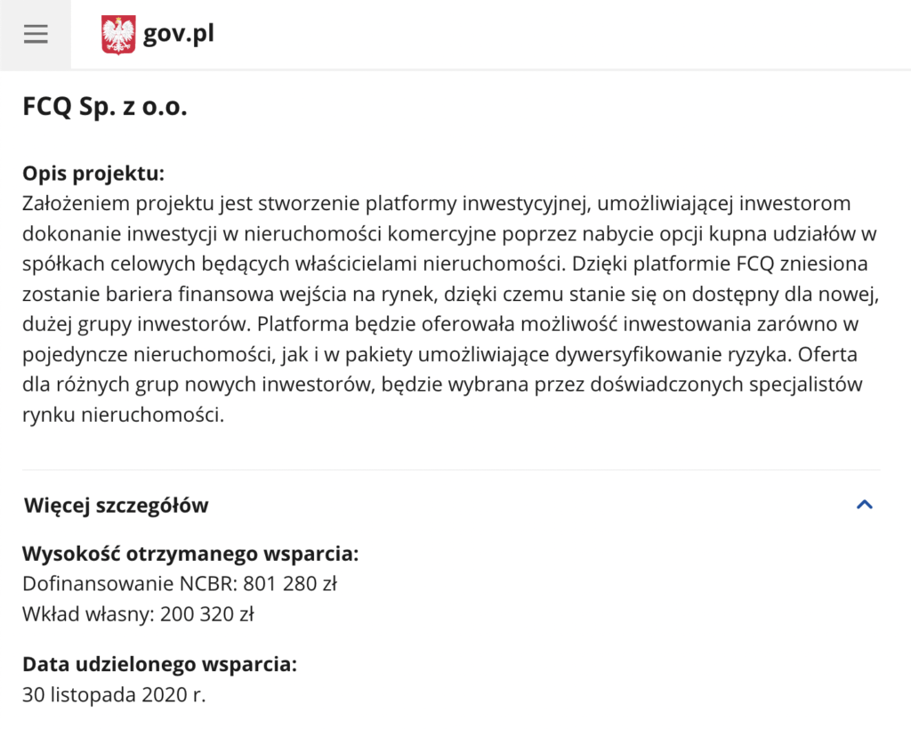 Na zakończenie warto wspomnieć, iż platforma FCQ Sp. z o.o. 30 listopada 2020 r. otrzymała dofinansowanie z Narodowego Centrum Badań i Rozwoju wysokości 801.280,00 PLN za MVP (minimalną wersję produktu). A w maju 2021 r. uruchomiona została wersja beta platformy FCQPlatform.