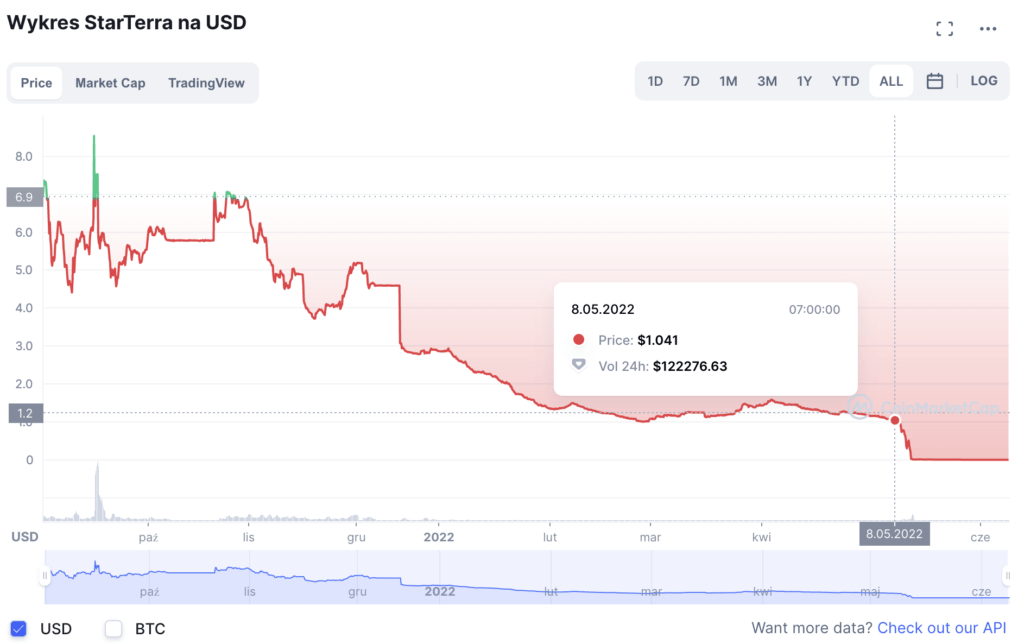 (źródło: link)Jak widać na powyższym wykresie, token STT nie radził sobie zbyt dobrze, podstaw takiego zjawiska oczywiście może być wiele. Można zrzucać to na złe otoczenie rynkowe – jak pamiętamy BTC jest w trendzie spadkowym od listopada, warto jednak pamiętać, iż w tym samym czasie LUNA i większa część jej ekosystemu rosła na wartości.