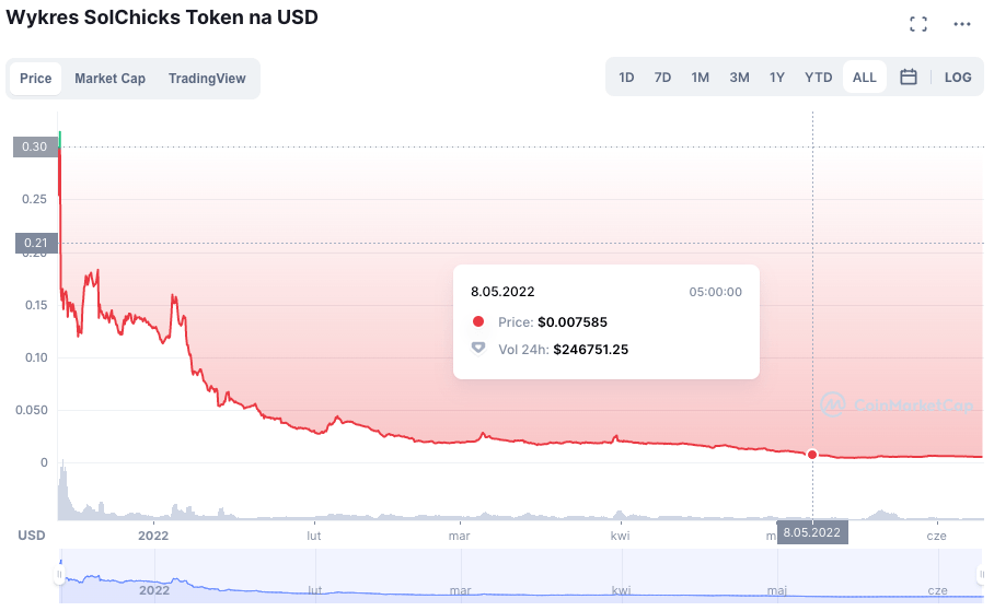 (źródło: link) Należy wziąć pod uwagę, iż cena tokenów dostępna w IDO była niższa niż ta, którą widzimy na wykresach, jednakże tokeny były w trwającym co najmniej kilka miesięcy vestingu, więc nie były one od razu dostępne dla inwestorów do sprzedania, ale uwalniane codziennie przez okres: 9 miesięcy w przypadku PlayNity, 90 dni w przypadku SolChicks i 11 miesiecy w przypadku Loop Finance